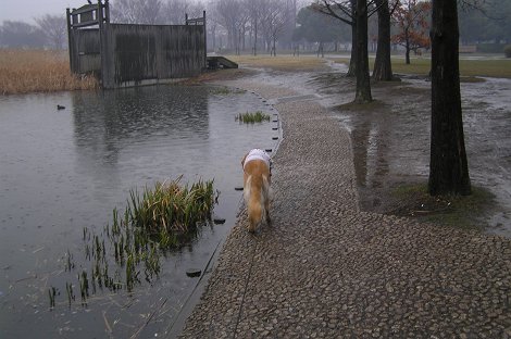 ▲先日の雨の日の散歩の様子。雨の日は足取りが重いチャロです。