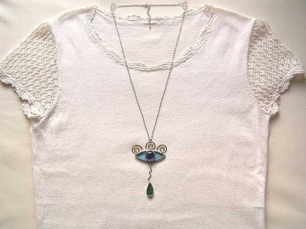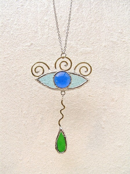 ドロップのようなステンドグラスに使われるガラスを使用しています。渦巻き部分等は真鍮線を使用。